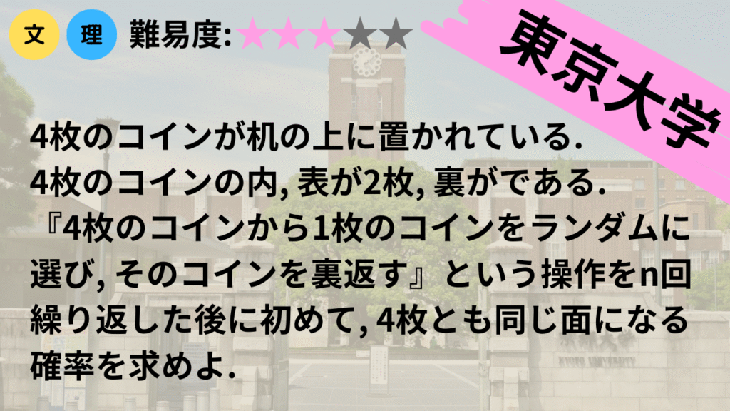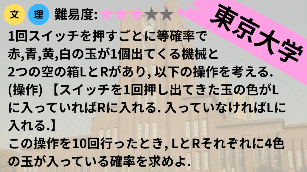 【東京大学入試】カード入れ替えで初めて全同色になる確率を求める(2008)