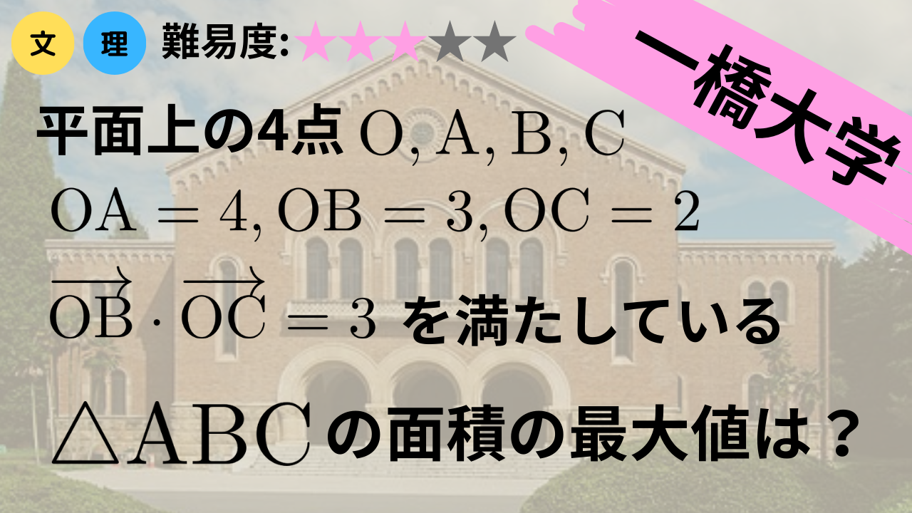 平面上の\(4\)点\(\mathrm{O}\), \(\mathrm{A}\), \(\mathrm{B}\), \(\mathrm{C}\)が, \(\mathrm{OA}=4\), \(\mathrm{OB}=3\), \(\mathrm{OC}=2\), \(\overrightarrow{\mathrm{OB}}\cdot\overrightarrow{\mathrm{OC}}=3\)を満たすとき, \(\triangle{\mathrm{ABC}}\)の面積の最大値を求めよ.