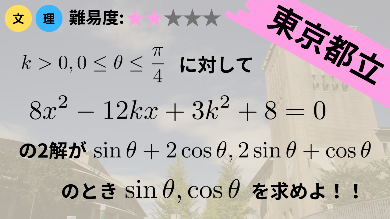 \(k\)を正の実数とし, \(2\)次方程式\(8x^2-12kx+3k^2+8=0\)は\(\sin{\theta}+2\cos{\theta}\), \(2\sin{\theta}+\cos{\theta}\)を解に持つとする. ただし, \(\displaystyle 0\leq\theta\leq\frac{\pi}{4}\)とする. このとき, 以下の問いに答えよ.