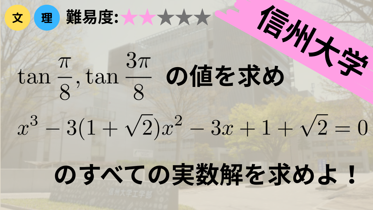 $$となる. これから, \(\displaystyle \tan{\frac{\pi}{8}}=\sqrt{2}-1\)は\(3\)次方程式\(x^3-3(1+\sqrt{2})x^2-3x+1+\sqrt{2}=0\)の解になること, そして, この\(3\)次方程式の左辺は\(x-(\sqrt{2}-1)\)で割り切れること, がわかる.