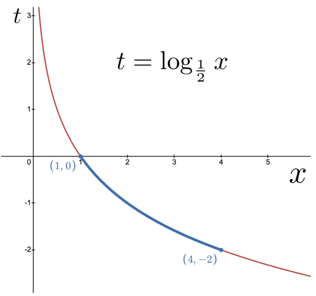 (2) \(t=\log_{\frac{1}{2}}{x}\)のグラフから, \(1\leq x\leq 4\)のとき, \(-2\leq t\leq 0\)である.