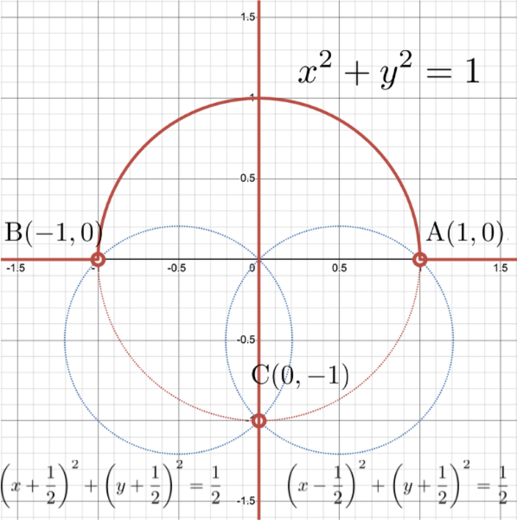 &「\left(X-\frac{1}{2}\right)^2+\left(Y+\frac{1}{2}\right)^2-\frac{1}{2} \leq 0\,\,かつ\,\,\left(X+\frac{1}{2}\right)^2+\left(Y+\frac{1}{2}\right)^2-\frac{1}{2}\leq 0」