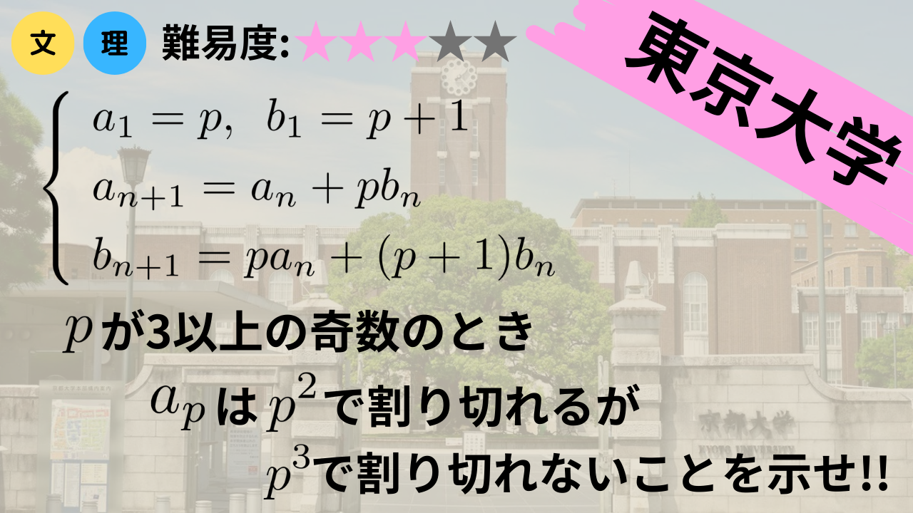 \left\{\begin{aligned} &\,\,a_1=p,\,\,\,b_1=p+1\\ &\,\,a_{n+1}=a_n+pb_n\,\,\,\,\,\qquad\qquad (n=1,2,3,\cdots)\\ &\,\,b_{n+1}=pa_n+(p+1)b_n\qquad(n=1,2,3,\cdots) \end{aligned}\right.$$(1) \(n=1,2,3,\cdots\)に対し, 次の\(2\)数がともに\(p^3\)で割り切れることを示せ.$$