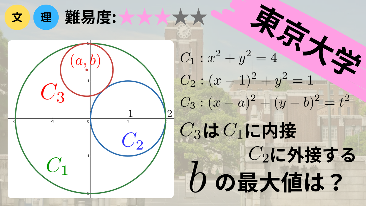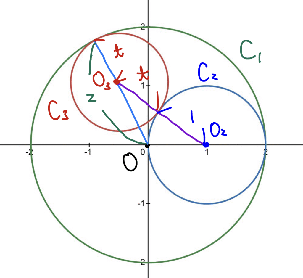 円\(C_1\), \(C_2\), \(C_3\)の中心をそれぞれ\(\mathrm{O}(0,0)\), \(\mathrm{O_2}(1,0)\), \(\mathrm{O_3}(a,b)\)とおくと, \(C_3\)と\(C_1\)に内接することから,$$