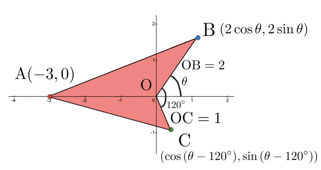 (1) \(\mathrm{B}\), \(\mathrm{C}\)を図示すると以下のようになり, 座標はそれぞれ, \((2\cos{\theta}, 2\sin{\theta})\), \((\cos{(\theta-120^\circ)}, \sin{(\theta-120^\circ)})\)となる.